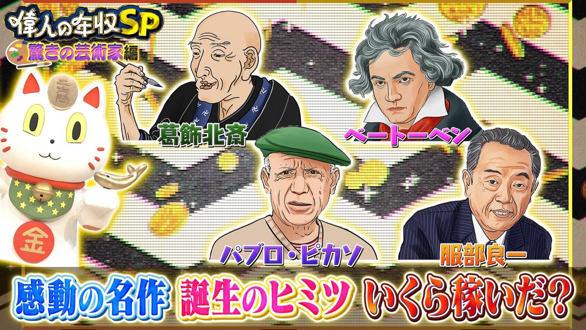 あの名画、あの名曲はどのようにして生まれたの?芸術家たちはどれだけ稼いでいたの?いままで番組で紹介した7人をランキングすると、天才たちの素顔が見えてくる!先輩後輩の浮世絵師、葛飾北斎と歌川広重の年収はどちらが高い?ベートーベンが「第九」を作曲した理由は?作曲家・服部良一と古関裕而、戦時中の違いは?ピカソの絵はなぜ高額なの?多彩な偉人たちを演じ分ける今野浩喜と、谷原章介、山崎怜奈の鋭い反応にも注目!