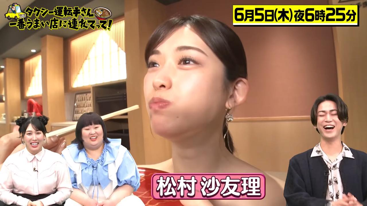 本日6月5日(木)18:25放送のテレビ東京「タクシー運転手さん一番うまい店に連れてって! 2時間半SP」に、松村沙友理さんがVTR出演します。