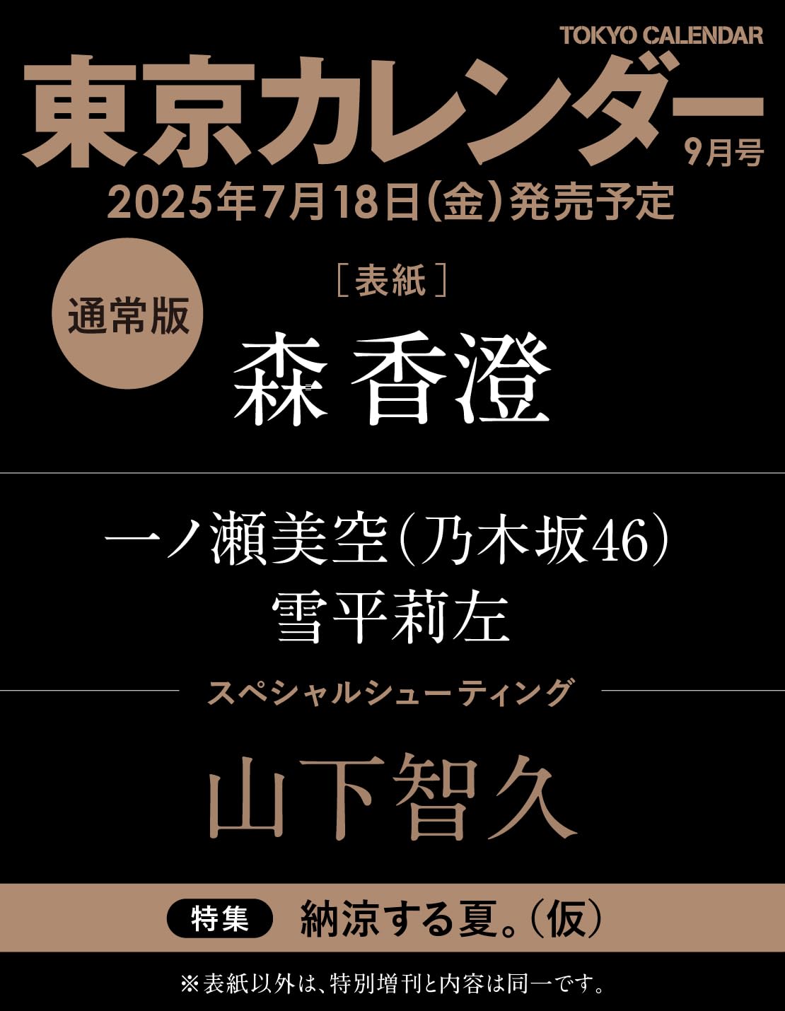 7月18日(金)発売の「東京カレンダー 2025年 9月号」に乃木坂46 一ノ瀬美空さんが登場しています。