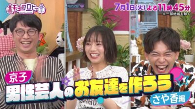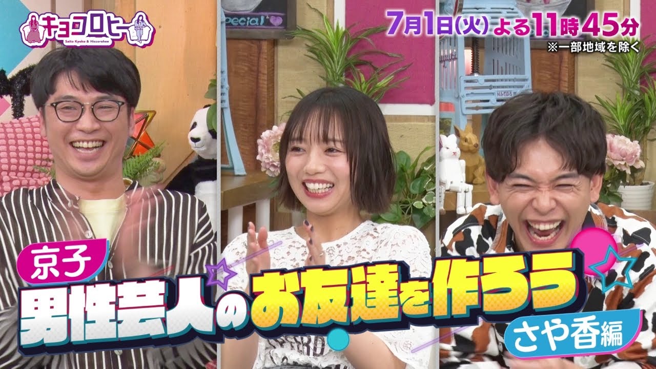 芸能界では俳優と芸人など意外な組み合わせで友達関係になると、話題になったり好感度がアップすることがある!そこで今回は、京子も男性芸人のお友達を作ることができるのか?さや香の2人をゲストに招き、石井、新山がそれぞれ挑戦!前室で京子と2人きりになり心をつかむトークを披露。果たして京子に相性の良さをアピールし、お友達になることができたのか?お楽しみに!
