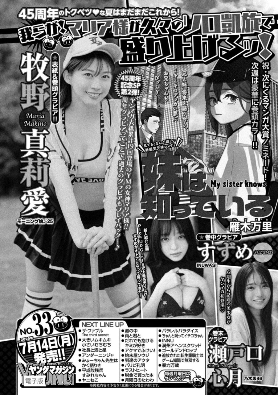 2025年7月7日(月) リリースピックアップ乃木坂46瀬戸口心月 乃木坂46 瀬戸口心月、巻末グラビア!「週刊ヤングマガジン 2025年 No.33」7/14発売! ポストする シェアする LINEで送る 来週7月14日(月)発売の「週刊ヤングマガジン 2025年 No.33」の巻末グラビアは乃木坂46 瀬戸口心月さんです。 Amazonで見る 表紙が公開され次第、改めてお知らせします。 その他アイドル掲載誌の新着情報はアイドル雑誌情報Zでチェック! 関連リンク 週刊ヤングマガジン – ヤングマガジン公式サイト ヤングマガジン編集部(@magazine_young) – X ヤンマガグラビア(@yanmaga_g) – X 乃木坂46公式サイト 乃木坂46(@nogizaka46) – X 乃木坂46(@nogizaka46_official) – TikTok 乃木坂46 – YouTube 乃木坂配信中 – YouTube 週刊ヤングマガジン 2025年 No.33 発売日:2025年7月14日(月) 公式サイト X 乃木坂46 瀬戸口心月 Amazon セブンネット 楽天市場 Yahoo!ショッピング BRODY 2025年 8月号 発売日:2025年6月23日(月) 公式サイト X 乃木坂46 瀬戸口心月 / 今泉佑唯 Amazon セブンネット 楽天ブックス Yahoo!ショッピング BOMB 2025年 7月号 発売日:2025年6月9日(月) 公式サイト X 乃木坂46 瀬戸口心月 Amazon セブンネット 楽天ブックス タワーレコード 乃木坂46瀬戸口心月 ポストする シェアする LINEで送る