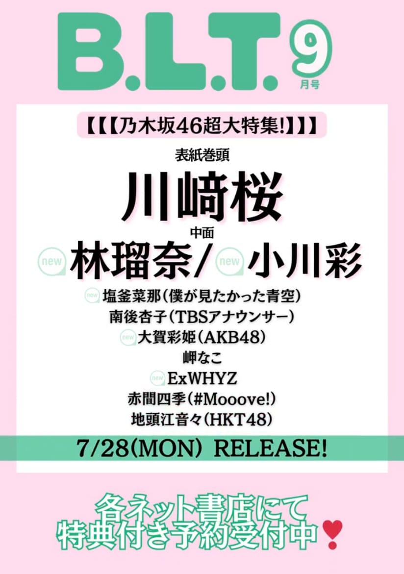 7月28日(月)発売の「B.L.T. 2025年 9月号」の表紙&巻頭特集は乃木坂46 川﨑桜さんです。中面に林瑠奈さん、小川彩さんも登場しています。