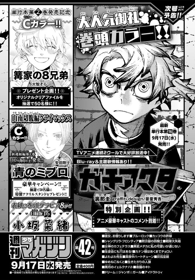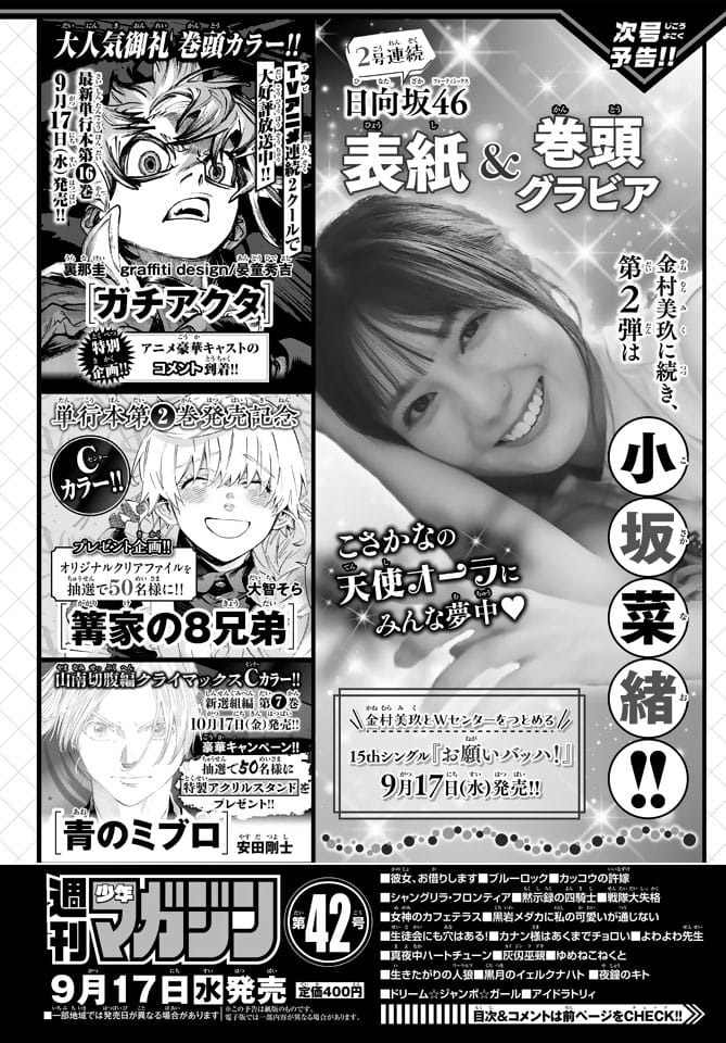 2025年9月16日(火) リリースピックアップ日向坂46小坂菜緒 日向坂46 小坂菜緒、表紙&巻頭グラビア!「週刊少年マガジン 2025年 No.42」9/17発売! ポストする シェアする LINEで送る 9月17日(水)発売の「週刊少年マガジン 2025年 No.42」の表紙&巻頭グラビアは日向坂46 小坂菜緒さんです。 Amazonで見る Kindle版(電子書籍) その他アイドル掲載誌の新着情報はアイドル雑誌情報Zでチェック! リンク 週刊少年マガジン 公式サイト 週刊少年マガジン公式(@shonenmagazine1) – X 週刊少年マガジン公式(@shonenmagazine.kousiki) – Instagram 日向坂46公式サイト 日向坂46(@hinatazaka46) – X 日向坂46 – YouTube 日向坂ちゃんねる – YouTube 週刊少年マガジン 2025年 No.42 発売日:2025年9月17日(水) 公式サイト X 日向坂46 小坂菜緒 Amazon セブンネット 楽天市場 Yahoo!ショッピング 週刊少年マガジン 2025年 No.41 発売日:2025年9月10日(水) 公式サイト X 日向坂46 金村美玖 Amazon セブンネット 楽天市場 Yahoo!ショッピング 日向坂46 15thシングル「お願いバッハ!」 発売日:2025年9月17日(水) 公式サイト X 日向坂46 Amazon セブンネット 楽天ブックス タワーレコード 日向坂46小坂菜緒 ポストする シェアする LINEで送る