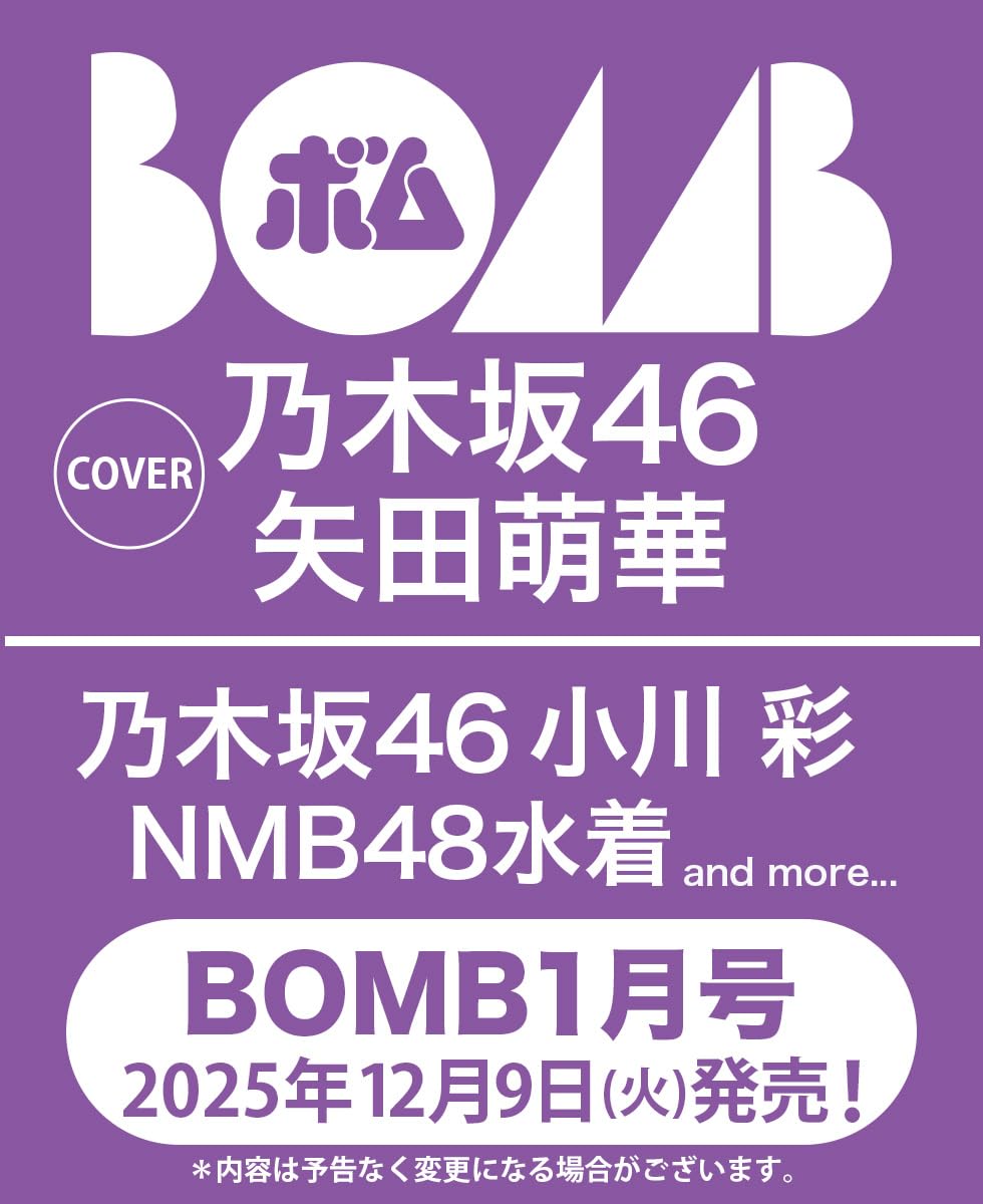 12月9日(火)発売の「BOMB 2026年 1月号」の表紙&巻頭グラビアは乃木坂46 矢田萌華さんです。小川彩さんのグラビアも掲載されています。