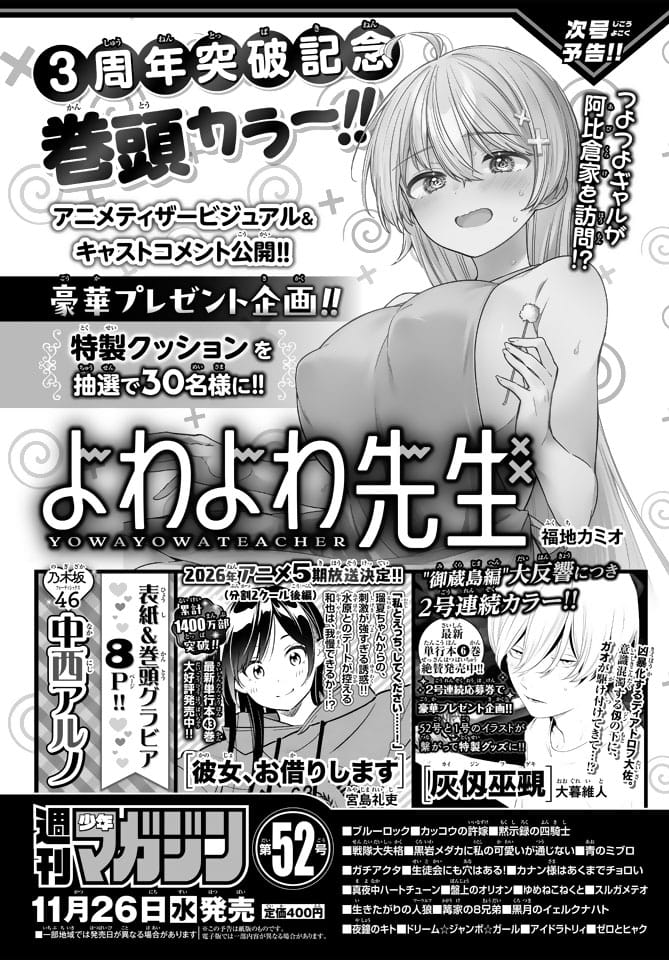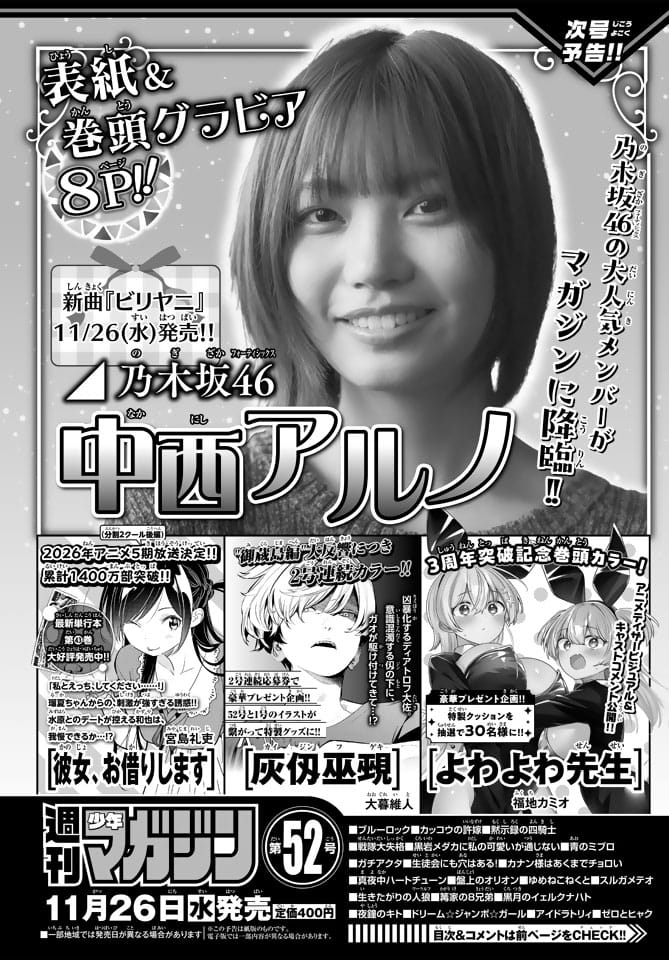2025年11月26日(水) リリースピックアップ乃木坂46中西アルノ 乃木坂46 中西アルノ、表紙&巻頭グラビア!「週刊少年マガジン 2025年 No.52」本日11/26発売! ポストする シェアする LINEで送る 本日11月26日(水)発売の「週刊少年マガジン 2025年 No.52」の表紙&巻頭グラビアは乃木坂46 中西アルノさんです。 Amazonで見る Kindle版(電子書籍) その他アイドル掲載誌の新着情報はアイドル雑誌情報Zでチェック! リンク 週刊少年マガジン 公式サイト 週刊少年マガジン公式(@shonenmagazine1) – X 週刊少年マガジン公式(@shonenmagazine.kousiki) – Instagram 乃木坂46公式サイト 乃木坂46(@nogizaka46) – X 乃木坂46(@nogizaka46_official) – TikTok 乃木坂46 – YouTube 乃木坂配信中 – YouTube 週刊少年マガジン 2025年 No.52 発売日:2025年11月26日(水) 公式サイト X 乃木坂46 中西アルノ Amazon セブンネット 楽天市場 Yahoo!ショッピング 乃木坂46 40thシングル「ビリヤニ」 発売日:2025年11月26日(水) 公式サイト X 乃木坂46 Amazon セブンネット 楽天ブックス タワーレコード 乃木坂46 5thアルバム「My respect」 発売日:2026年1月14日(水) 公式サイト X 乃木坂46 Amazon セブンネット 楽天ブックス タワーレコード 乃木坂46中西アルノ ポストする シェアする LINEで送る