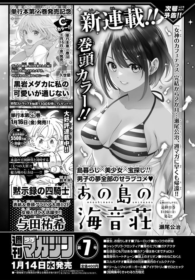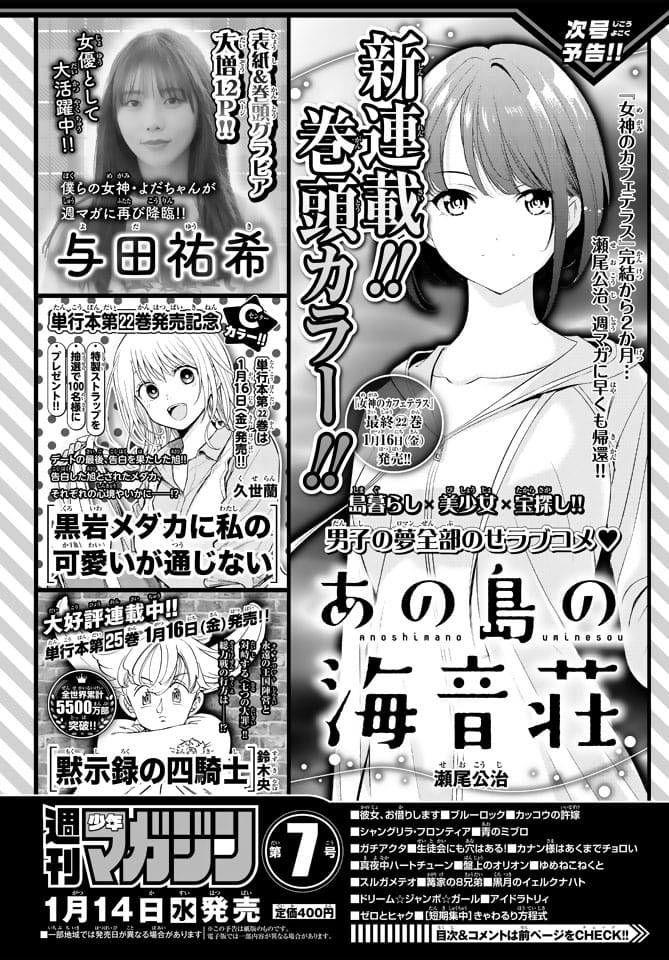 2026年1月7日(水) リリースピックアップ与田祐希 与田祐希、表紙&巻頭グラビア!「週刊少年マガジン 2026年 No.7」1/14発売! ポストする シェアする LINEで送る 来週1月14日(水)発売の「週刊少年マガジン 2026年 No.7」の表紙&巻頭グラビアは与田祐希さんです。 Amazonで見る セブンネットで見る 表紙が公開され次第、改めてお知らせします。 その他アイドル掲載誌の新着情報はアイドル雑誌情報Zでチェック! リンク 週刊少年マガジン 公式サイト 週刊少年マガジン公式(@shonenmagazine1) – X 週刊少年マガジン公式(@shonenmagazine.kousiki) – Instagram 与田祐希(@yodayuuki_oimo) – Instagram 週刊少年マガジン 2026年 No.7 発売日:2026年1月14日(水) 公式サイト X 与田祐希 Amazon セブンネット 楽天市場 Yahoo!ショッピング 与田祐希 ポストする シェアする LINEで送る