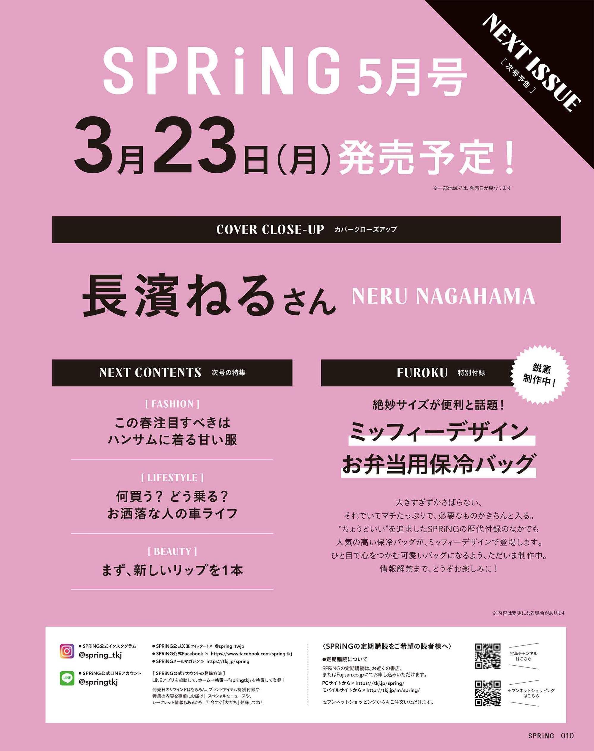 3月23日(月)発売の「SPRiNG 2026年 5月号」の表紙は長濱ねるさんです。