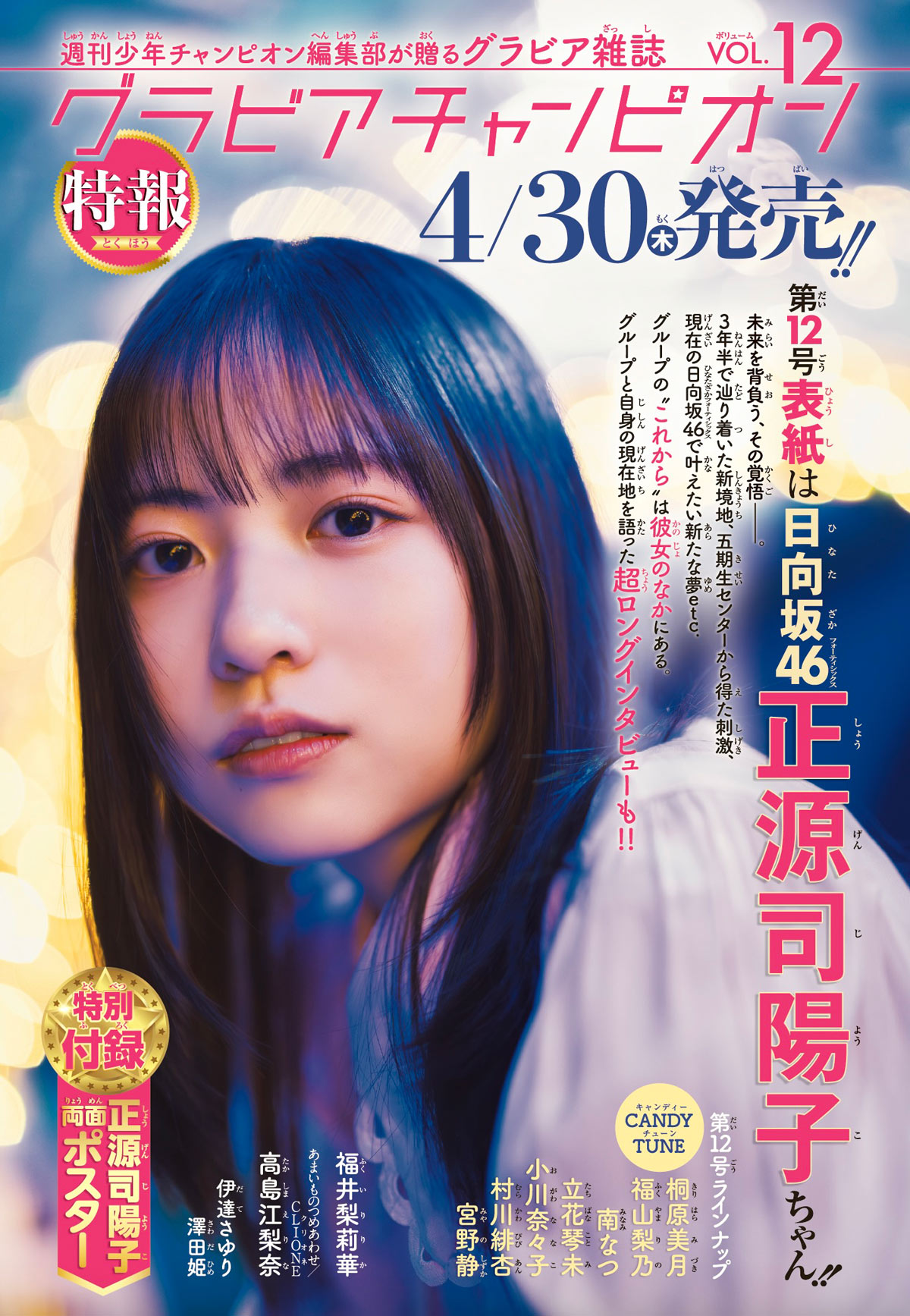 4月30日(木)発売の「グラビアチャンピオン VOL.12」の表紙&巻頭特集は日向坂46 正源司陽子さんです。中面に日向坂46 宮地すみれさんも登場しています。