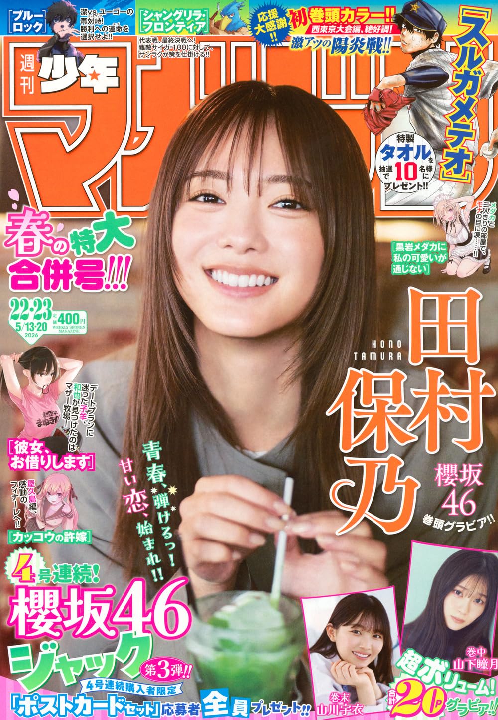 4月28日(火)発売の「週刊少年マガジン 2026年 No.22・23 合併号」の表紙&巻頭グラビアは櫻坂46 田村保乃さん、巻中グラビアは山下瞳月さん、巻末グラビアは山川宇衣さんです。