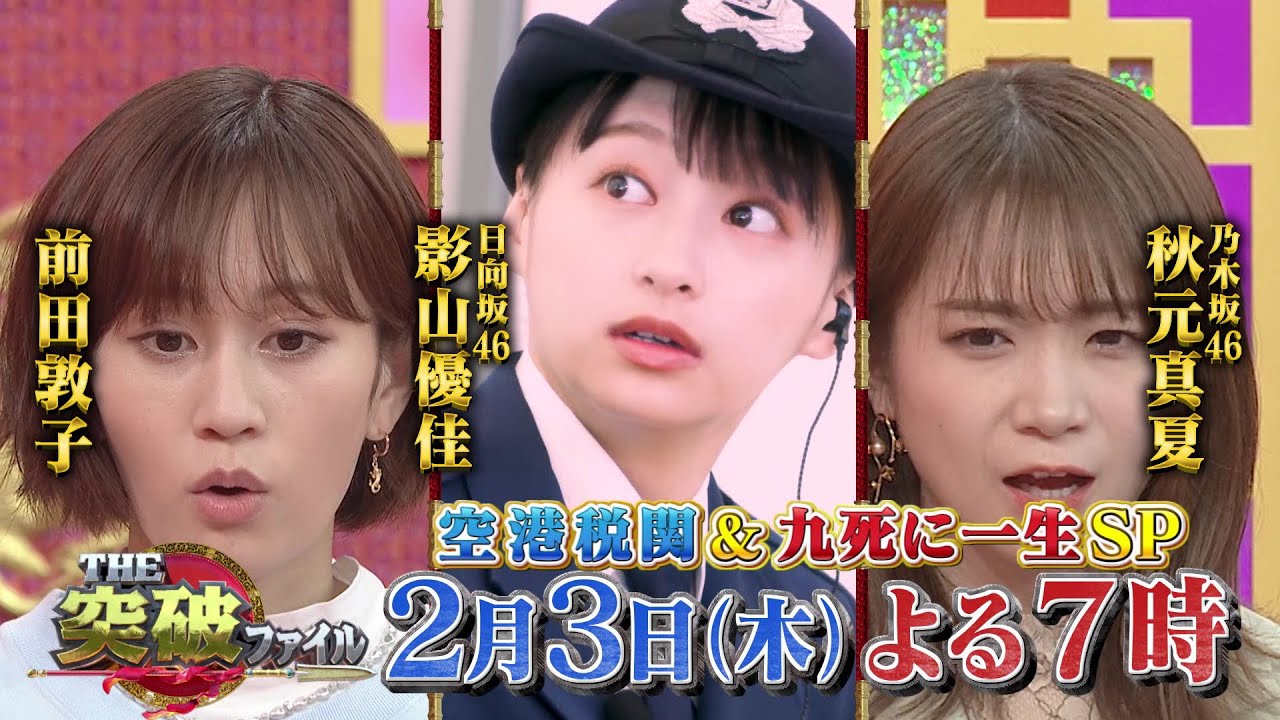 本日2月3日(木)19:00放送の日本テレビ「THE突破ファイル」に、乃木坂46 秋元真夏さん、賀喜遥香さん、日向坂46 影山優佳さんが出演します。