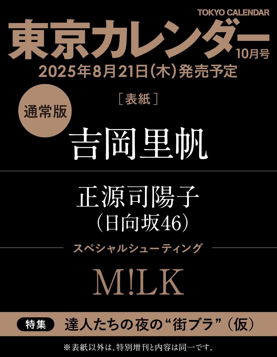 PR 東京カレンダー 2025年 10月号 発売日:2025年8月21日(木) リンク:公式サイト X 【通常版】表紙 吉岡里帆ナイトホッピングする西麻布の夜。 【特別増刊】表紙 M!LKホットなホテルでホットな5人。 特集 達人たちの夜の“街ブラ” 掲載 正源司陽子(日向坂46)神楽坂で大人の買い食い。 Amazon セブンネット 楽天ブックス Yahoo!ショッピング ポストする シェアする LINEで送る
